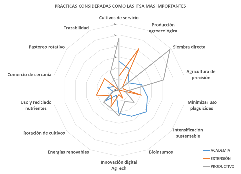 De la mencionada investigación también surge que los académicos mencionan la intensificación sustentable, los cultivos de servicio, el uso de bioinsumos y el uso de alternativas al uso de herbicidas como las ITSA más importantes de la región (Figura 1). Los extensionistas nombraron principalmente la producción agroecológica y en menor medida el minimizar el uso de plaguicidas y el uso y reciclado de nutrientes. Por su parte, los encuestados del ámbito productivo refirieron en mayor medida a la siembra directa, los cultivos de servicio, la agricultura de precisión y las tecnologías AgTech.