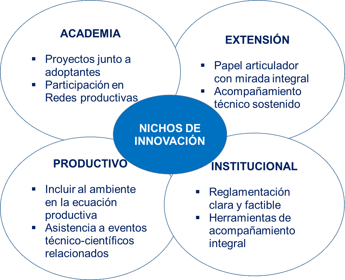 Estas diferencias en sus miradas se asocian a distintos niveles de adopción de las ITSA, siendo mayor la diferencia entre los productores y la academia, reforzando la necesidad de fomentar el trabajo transdisciplinario (Auer et al., 2024b). Es importante considerar que se podría generar más sinergia que facilite la innovación si hubiera un mayor nivel de interacción entre los diferentes ámbitos, académico, de extensión, productivo y no menos importante, el institucional, a partir de la inclusión de reglamentaciones claras y factibles de aplicabilidad, y con herramientas de acompañamiento integrales (Figura 2).
