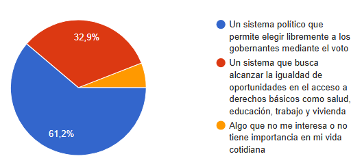En relación con la primera, la mayoría de las respuestas reflejó una concepción formal de la democracia (61,2 %, 186 casos), entendida principalmente como un sistema basado en el voto y en las libertades políticas. Casi un tercio de los encuestados (32,9 %, 100 casos) se inclinó, en cambio, por una visión sustantiva de la democracia, que la asocia con la igualdad social y la garantía de derechos. Un grupo reducido (5,9 %, 18 casos) manifestó desinterés o falta de identificación con la democracia como forma de gobierno.