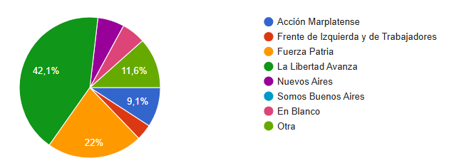 Al ser indagados por su opción electoral en los comicios del 7 de septiembre en la provincia de Buenos Aires, los 164 encuestados que asistieron a votar el 42,1 % (69) eligió a la fuerza oficialista a La Libertad Avanza, el 22 % (36) a Fuerza Patria, el 11,6 % (19) a otra fuerza política diferente a las incluidas en las opciones, el 9,1 % (15) a Acción Marplatense, el 6,1 % (10) a Nuevos Aires, el 5,5 % (9) en blanco y, finalmente, el 3,7 % (6) al Frente de Izquierda y de Trabajadores.[3]