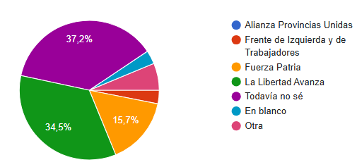 Al proyectar la intención de voto las preferencias no evidencian cambios sustanciales en términos numéricos respecto de las elecciones pasadas. El cambio más relevante se relaciona con el porcentaje de indecisos que alcanza el porcentaje más elevado (37,2 %, 83 casos), seguido por La Libertad Avanza con un 34,5 % (77 casos), Fuerza Patria con un 15,7 % (35 casos) y otras fuerzas políticas no incluidas entre las opciones sugeridas, con un 6,3 % (14 casos). Finalmente, el Frente de Izquierda y de Trabajadores y el voto en blanco registran, respectivamente, un 3,1 % (7 casos) cada uno.